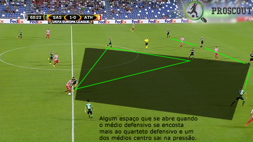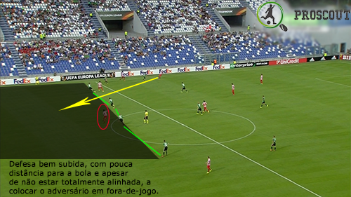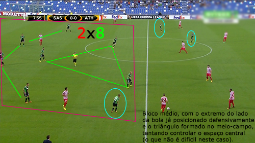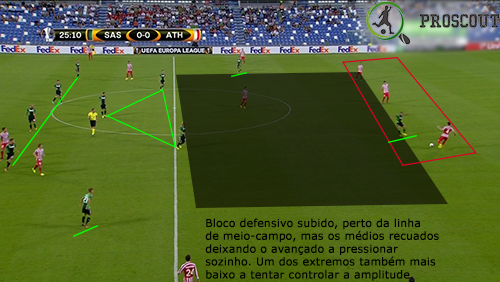 Poucas referências individuais têm em organização defensiva, comportando-se mediante referências zonais. Por vezes ainda abrem espaços, já que o médio defensivo tem a tendência em algumas situações de se encostar à linha defensiva. O espaço para ser fechado é o corredor central, sempre, com a linha defensiva bem definida e com os extremos muitas vezes a ajudar no controlo da amplitude. Neste jogo, mostraram por vezes dificuldade em controlar a profundidade, já que o Athletic tentava colocar muitas bolas nas costas da defesa, mas também é certo que conseguiram colocar muitas vezes o jogador adversário em situação de posição irregular.