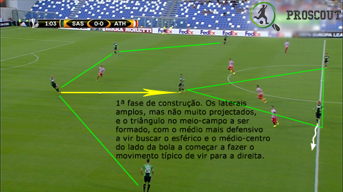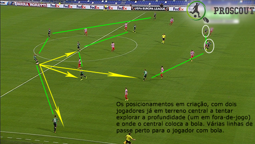 Em construção, tentam ter o maior critério possível, pois só com muita pressão batem longo na frente sem pensar muito, já que nas restantes vezes, tentam sair sempre a jogar com bola desde trás. Têm posicionamentos muito interessantes, como aquele que fazem nos pontapés de baliza a favor. Em criação, há normalmente várias soluções sempre disponíveis, mas nem sempre são encontradas por quem tem a bola. Buscam também bastante a profundidade nestes momentos, estando sempre preparados para tal.
